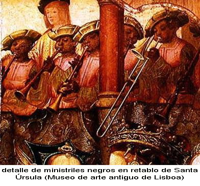 También existen referencias sobre la existencia de ministriles esclavos, como la capilla de de esclavos negros constituida en la catedral de Santiago de Cuba en 1682 siendo maestro de capilla Domingo Flores, quien encargó la instrucción musical de los esclavos al canónigo juan Cisnero Estrada y Luyando, los ministriles de galera a los que se refiere Felipe II en una carta a sus hijas fechada el 10 de Julio de 1581 en Lisboa «lo más es que con unos ministriles que son esclavos de la galera que son muy buenos y tañen muy bien muchos instrumentos«, o los «ministriles negrillos» de Felipe IV que amenizaban las veladas en el palacio del buen retiro de Madrid entre 1630 y 1640.