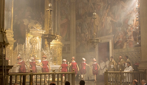 En esta ocasión, el coro del Real Colegio Seminario de Corpus Christi, dirigido por Rodrigo Madrid y acompañado por un conjunto de ministriles: cornetos, sacabuches, bajones y órgano interpretarán las danzas de Comes que serán bailadas por los infantes en el Altar Mayor de la iglesia.